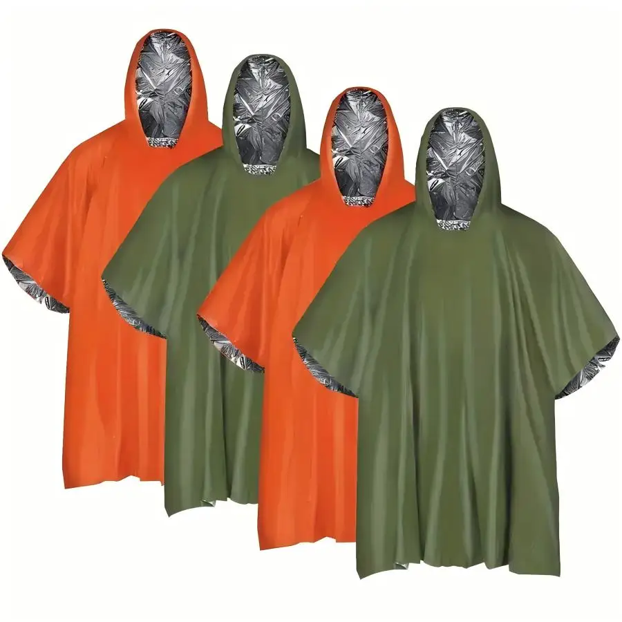 This emergency survival poncho is designed to provide protection and warmth during outdoor emergencies. The lightweight material helps retain body heat in cold or harsh conditions. It can be used during camping, hiking, and outdoor travel for added protection. The poncho design allows easy wear over clothing and gear. Its compact size makes it convenient to store in backpacks or emergency kits. The waterproof material helps protect against rain and moisture. It is suitable for emergency situations such as storms, earthquakes, and disasters. The durable construction supports reliable use in outdoor environments. The poncho can also function as a temporary shelter or thermal cover. This survival poncho is an essential piece of safety gear for outdoor adventures and emergency preparedness.